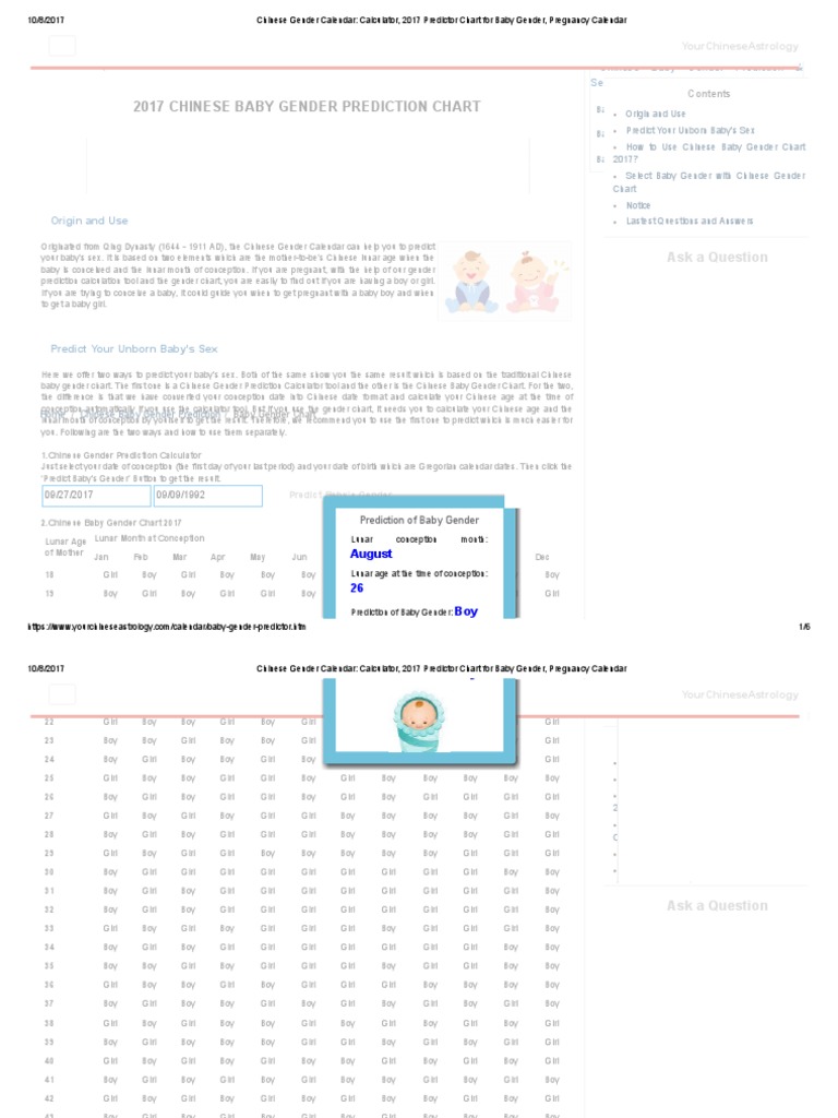 Chinese Gender Calendar Calculator, 2017 Predictor Chart For Baby