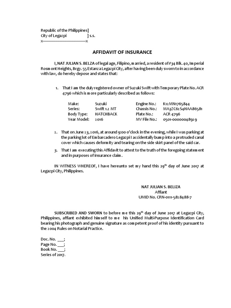 I, ____________________________________________________________________________first namelast name residing at _____________________________________________________________________. Web you need to learn the full extent of insurance coverage to maximize your potential recovery. On october 30, 2006, i was involved in an automobile accident. Web sample affidavit of no insurance. Enter all required information in the required fillable fields.