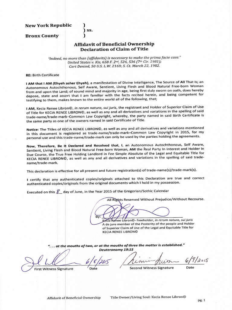 Affidavit of Beneficial Ownership Declaration of Claim of Title