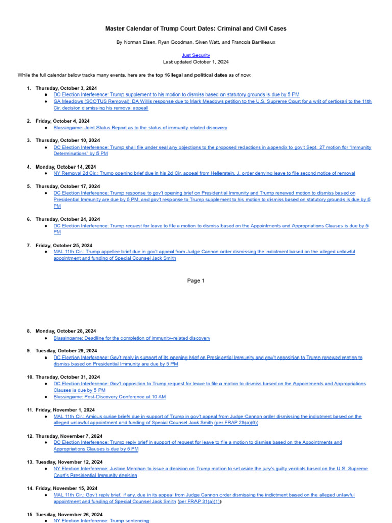 Master Calendar of Donald Trump Criminal and Civil Cases and Political