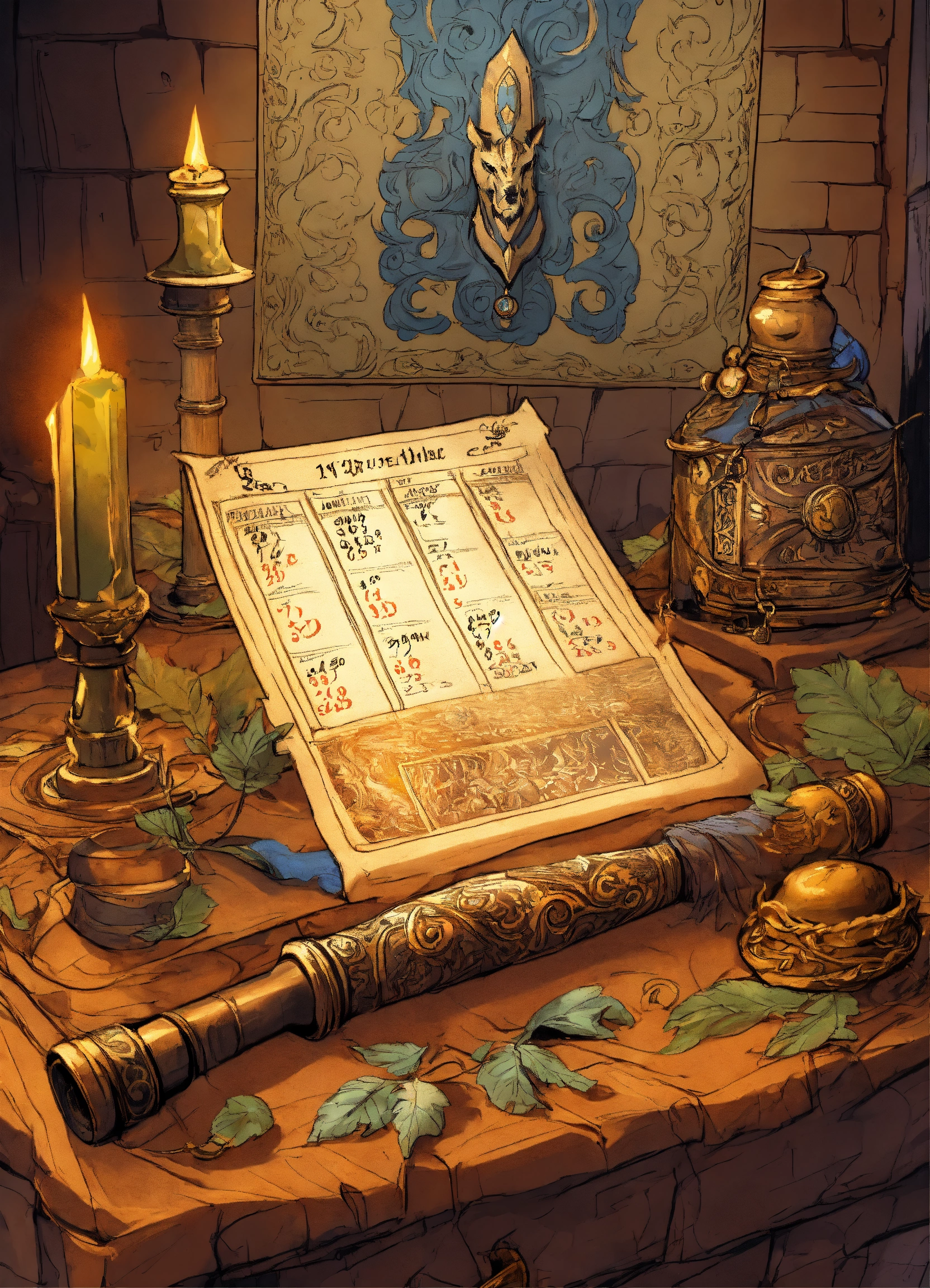Lexica A quill on a large druidic calendar, lying on a table, with