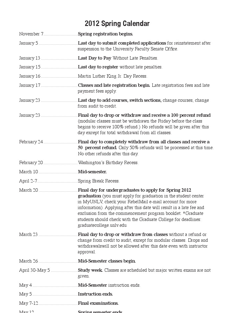 UNLV 2012 Spring Semester Calendar PDF Fee Academia