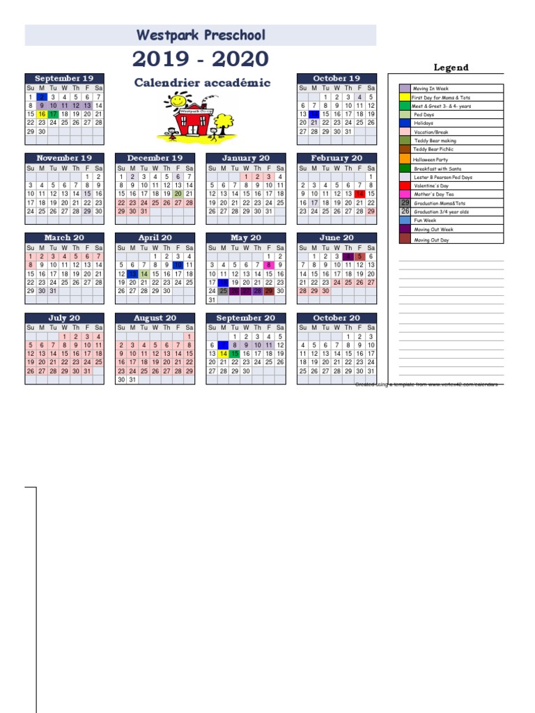 Westpark Preschool Calendar 201920 FR PDF Holidays Observances